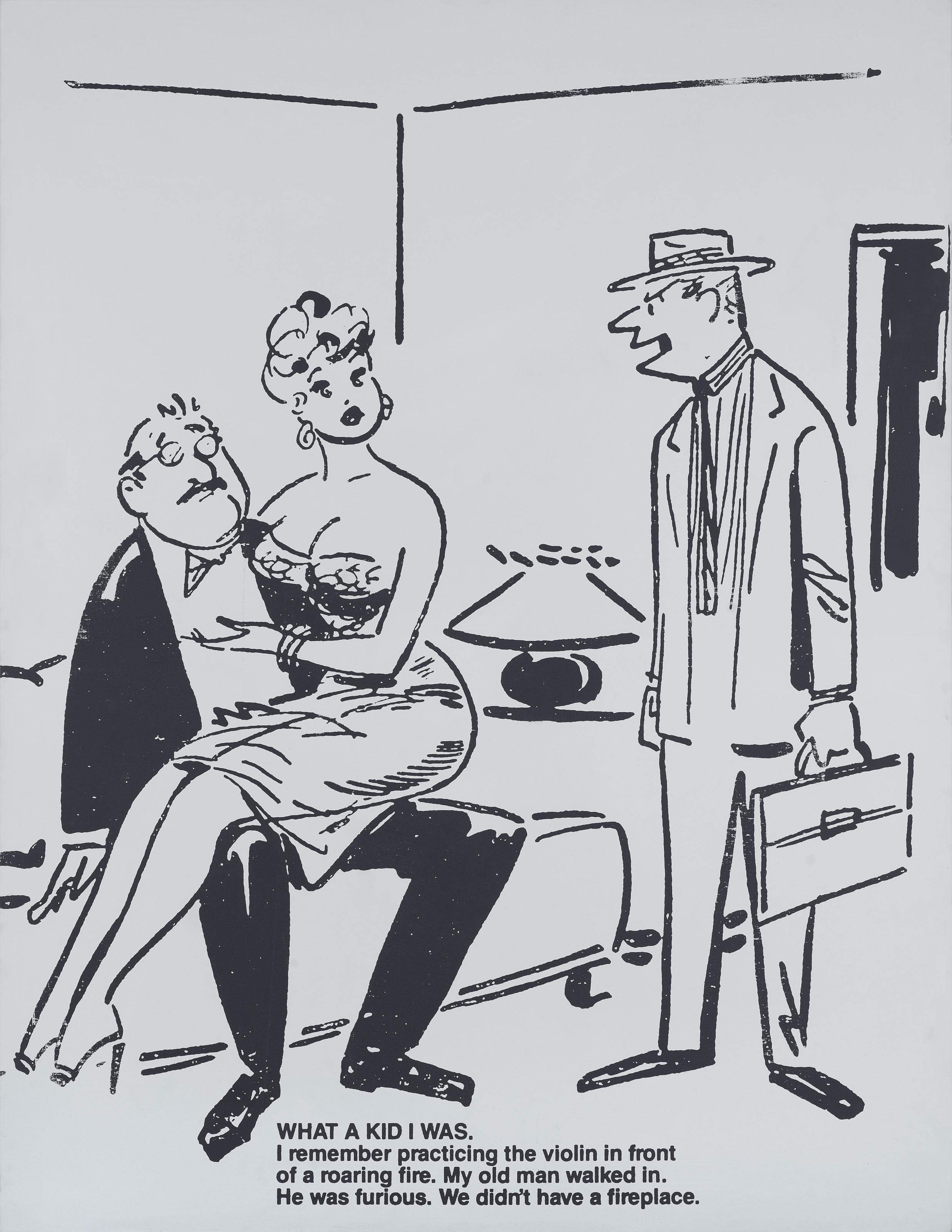 That being said, the body of work Prince produces during this time is conceptually and stylistically very similar to what Newgarden is doing in his cartoons: both reuse punchlines in their works, often recontextualizing them with standard gag cartoon images that deal with the tropes of the genre. In this example by Prince, a man has clearly walked in to his wife on another man’s lap; yet the “joke” caption Prince incorporates, while seemingly unrelated to the image, has interesting subtle connotations, where the cuckolded husband can also be identified as the father walking in on his son playing the violin. On one hand, text and image can stand alone here – ostensibly much like the captions in Newgarden’s work. And we might interpret the text/image combination here further: the “fire” here is not literal, but that of relationships and/or sex as suggested by the cartoon image. Yet, our brains suggest that to do so would be a disservice to the visual/textual links of this seeming non sequitur.