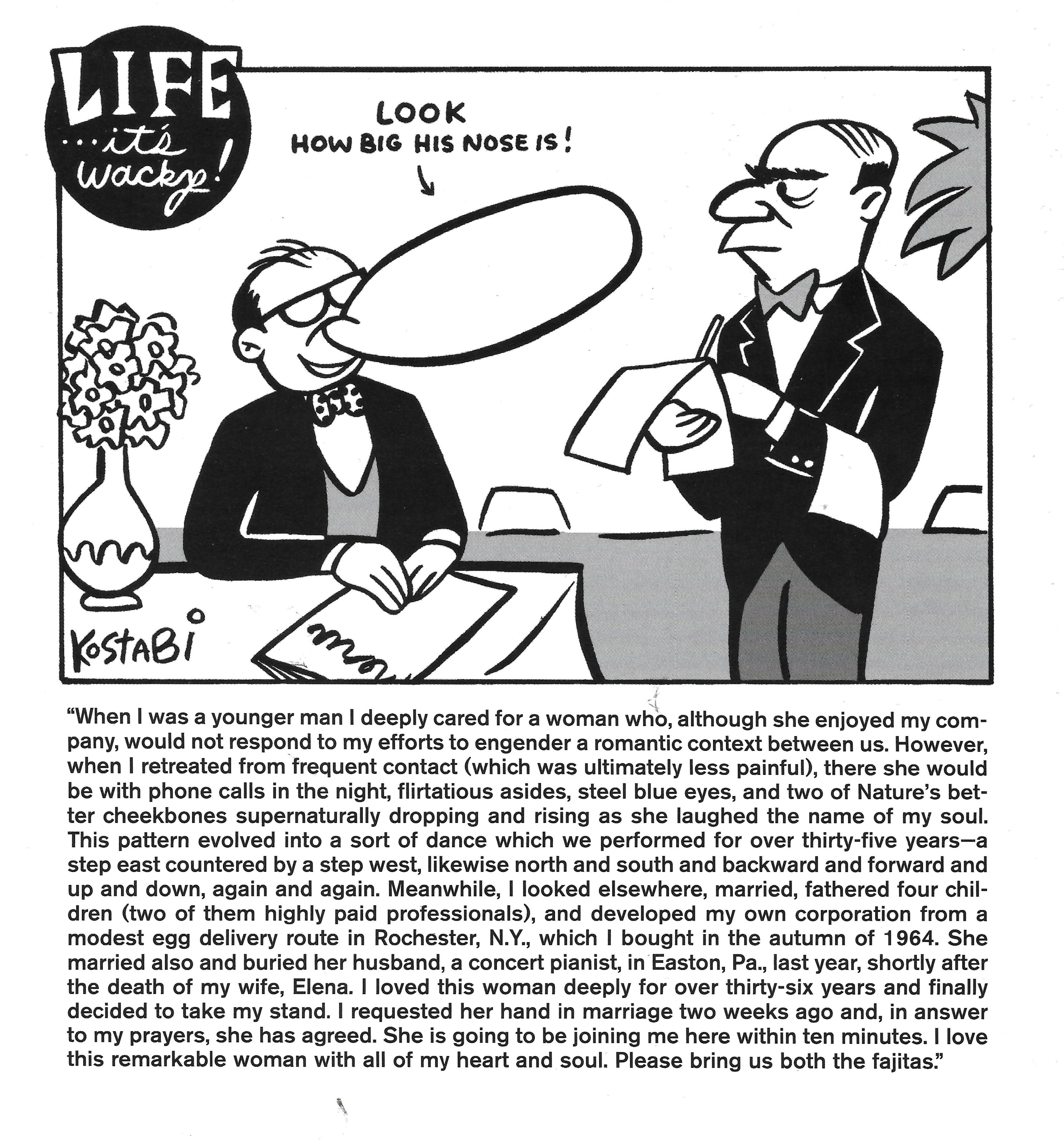 Mark Newgarden, "Life...it's wacky!," single-panel cartoon, publication unknown, 1989There is a surprising amount to unpack here: first, the comic, while wistful, is still funny because of the surprising mundanity of that last line. There are also gender stereotypes here, as the man is ordering food for the woman before she even arrives, which combined with the setting and style of the image above, relates to the common tropes of these mid-century cartoons, and the often deeply disturbing aspects of their humor: infidelity, misogyny, alcoholism, and so on. Finally, such single-panel cartoons often rely on brevity for their humor, and Newgarden subverts this with the combination of the 1950s-era cartoon style (what he dubs the “big nose” aesthetic) and the rambling, revelatory text.