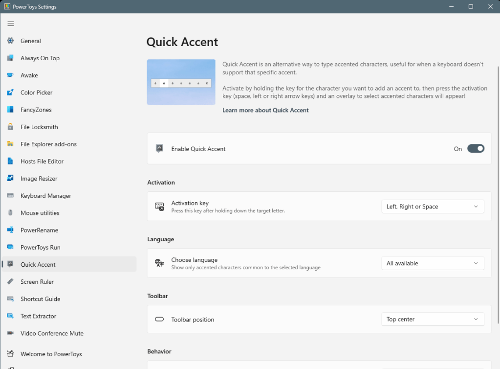 Here is how it works. First, the feature has just been added in a cool tool produced by Microsoft called PowerToys. This is the revitalization of a much older application by Microsoft that offers a lab of Windows tools and features that they can test out and might, perhaps, maybe one day be wrapped into Windows at the operating system level. It offers an ever-growing list of tools, like a built-in eyedropper tool, image resizer, screen ruler, and even a universal video conference mute tool. But recently, they added Quick Accent which essentially mimics the feature from OS X.